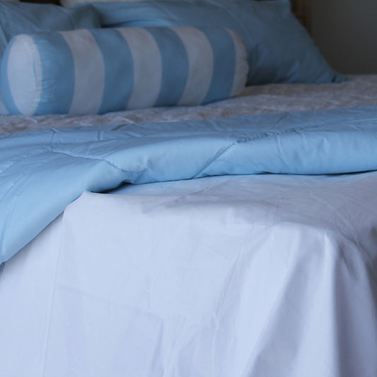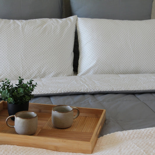 We designed our comforter sets to work with Aussie weather. Much of Australia experiences regular heat or humid conditions, and a comfortable sleep relies heavily on breathable fabrics that don't contribute to sweating. That's why we're so passionate about 100% cotton comforters. Cotton is great in warm weather due to its natural breathability, moisture-wicking properties, and hypoallergenic nature. While going full cotton may be a more expensive step up from regular off-the-shelf comforters, which are typically polyester or a blend of synthetics, we stand firm on being uncompromising on the quality of life this brings to our bedding.